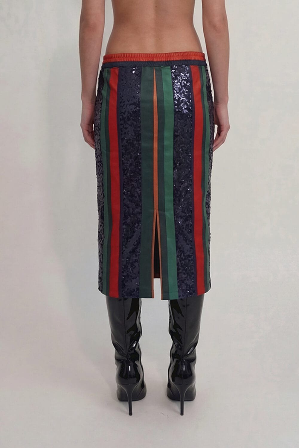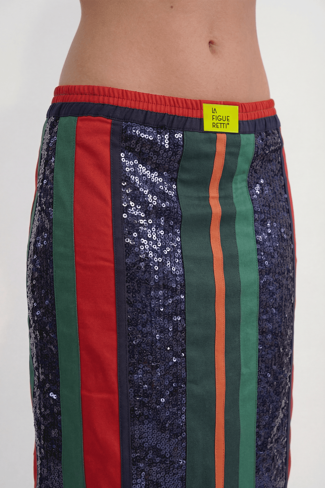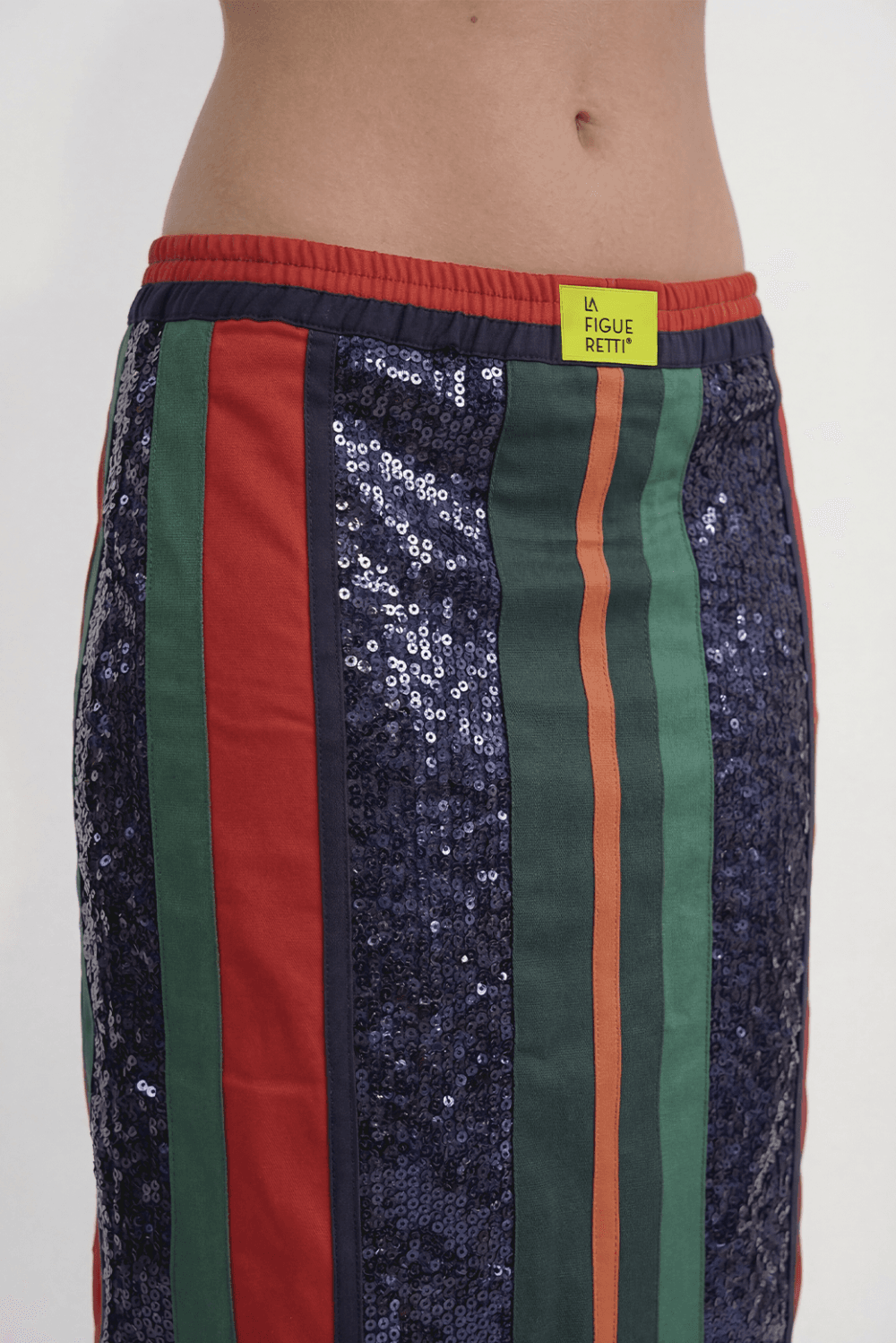 Confeccionada en una combinación de textiles, integra paneles en lentejuela con franjas verticales en tonos contrastantes que crean un efecto visual vibrante y dinámico. Los colores evocan la descomposición de la luz, como un prisma en movimiento.