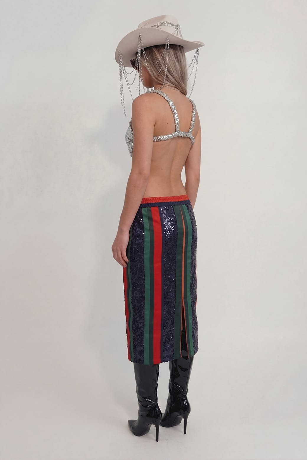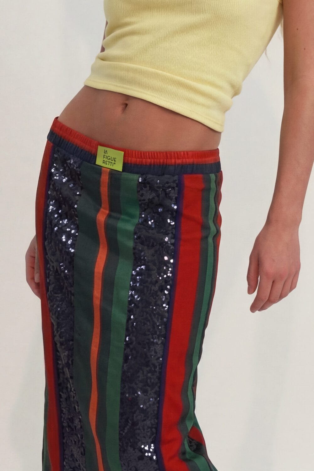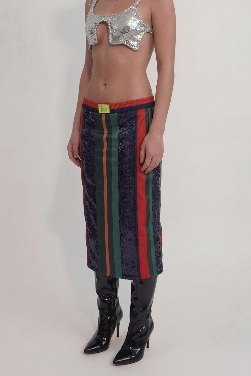 Confeccionada en una combinación de textiles, integra paneles en lentejuela con franjas verticales en tonos contrastantes que crean un efecto visual vibrante y dinámico. Los colores evocan la descomposición de la luz, como un prisma en movimiento.