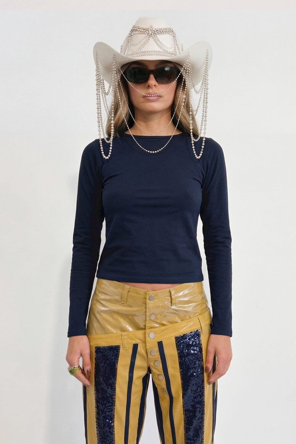 Combina un top base en polilycra de manga larga que se ajusta al cuerpo como una segunda piel, con una capa intermedia en rib que aporta textura y estructura, y un top en lentejuela con formas de estrellas que evoca un cielo nocturno sobre el cuerpo.