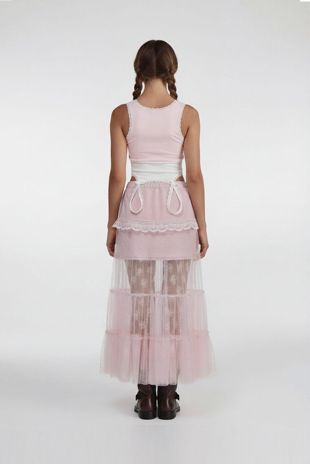 🧁 Extender la base rosa como capa inicial de una torta tradicional. Agregar el tul en niveles, dejando que el encaje francés bordado en ramas fluya como glaseado vegetal sobre la superficie.